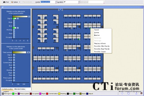 系統(tǒng)提供一整套管理工具,輔以圖形化的人性設(shè)計(jì),將復(fù)雜的設(shè)備維護(hù)和系統(tǒng)優(yōu)化簡化為簡單的圖形管理,降低了維護(hù)難度和對維護(hù)人員的要求,提高了維護(hù)效率,使聯(lián)絡(luò)中心更為穩(wěn)定可靠地運(yùn)行。座席地圖按真實(shí)座席位置展現(xiàn)座席狀態(tài),使業(yè)務(wù)代表服務(wù)質(zhì)量的監(jiān)控和檢查更為形象高效,有利于提升業(yè)務(wù)代表服務(wù)質(zhì)量。