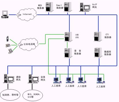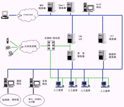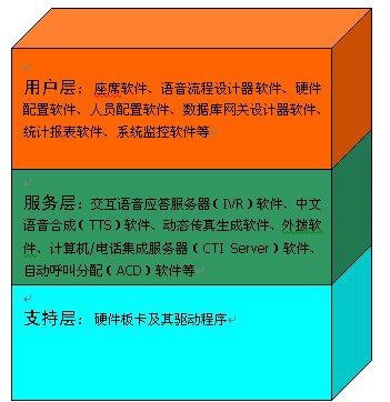 2、服務(wù)層:交互語(yǔ)音應(yīng)答服務(wù)器(IVR)軟件、中文語(yǔ)音合成(TTS)軟件、動(dòng)態(tài)傳真生成軟件、外撥軟件、計(jì)算機(jī)/電話集成服務(wù)器(CTI Server)軟件、自動(dòng)呼叫分配(ACD)軟件等等。
