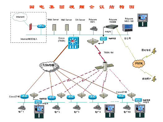 128,集團(tuán)下屬60個(gè)電廠均采用視頻終端ViewStation 128。整個(gè)網(wǎng)絡(luò)采用Polycom MCU的混速功能,在本部中心采用768Kbps進(jìn)行視頻傳輸,和下屬60個(gè)電廠及分公司采用128Kbps進(jìn)行傳輸。由于網(wǎng)絡(luò)傳輸線(xiàn)路分為衛(wèi)星線(xiàn)路和地面有線(xiàn)網(wǎng)絡(luò),衛(wèi)星線(xiàn)路帶寬為768Kbps-1Mbps,用于業(yè)務(wù)下行線(xiàn)路,地面有線(xiàn)網(wǎng)絡(luò)128Kbps用于視頻回傳。根據(jù)網(wǎng)絡(luò)傳輸線(xiàn)路的實(shí)際情況,在本部中心利用1臺(tái)視頻終端將其模擬信號(hào)(AV信號(hào))送到衛(wèi)星端接設(shè)備(包含MODEM,編解碼器等),將模擬信號(hào)轉(zhuǎn)換成數(shù)字信號(hào)(MPEG4),利用768K-1Mbps衛(wèi)星線(xiàn)路廣播到每個(gè)接收點(diǎn),通過(guò)每個(gè)接收點(diǎn)的編解碼器將數(shù)字信號(hào)轉(zhuǎn)換成模擬信號(hào)連接到顯示終端(如TV、顯示器)上進(jìn)行收看,通過(guò)這種方式可以實(shí)現(xiàn)利用衛(wèi)星線(xiàn)路的高帶寬,并利用其廣播特性,節(jié)省投資。