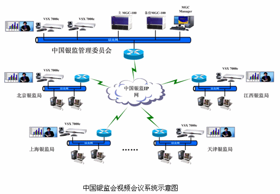 中國銀監(jiān)會目前已經(jīng)擁有一個高速、高可靠性的ATM骨干傳輸網(wǎng)絡(luò),網(wǎng)絡(luò)采用星形結(jié)構(gòu),各分支機(jī)構(gòu)到北京總部的線路均為2條15M ATM線路,這種優(yōu)良的網(wǎng)絡(luò)非常適合視頻會議業(yè)務(wù)的運(yùn)營。視頻會議網(wǎng)建立完成后可以實(shí)現(xiàn)通過遠(yuǎn)程視頻會議,遠(yuǎn)程處理重點(diǎn)銀行業(yè)金融機(jī)構(gòu)監(jiān)事會的日常管理工作;遠(yuǎn)程審查銀行業(yè)金融機(jī)構(gòu)高級管理人員任職資格;遠(yuǎn)程討論協(xié)商制定有關(guān)銀行業(yè)金融機(jī)構(gòu)監(jiān)管的規(guī)章制度和辦法;遠(yuǎn)程對銀行業(yè)金融機(jī)構(gòu)實(shí)監(jiān)管,依法對違法違規(guī)行為進(jìn)行查處;更加可以通過遠(yuǎn)程雙流會議,按照國家有關(guān)規(guī)定,遠(yuǎn)程公布全國銀行數(shù)據(jù)、報表。