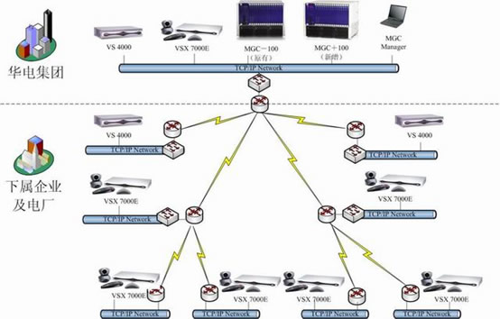 華電集團(tuán)領(lǐng)導(dǎo)十分重視電力信息化及華電集團(tuán)電子政務(wù)的建設(shè)工作。為了貫徹國務(wù)院對政府系統(tǒng)信息化建設(shè)的要求,實(shí)現(xiàn)華電集團(tuán)政務(wù)辦公和行業(yè)管理信息服務(wù)的電子化、網(wǎng)絡(luò)化,滿足華電集團(tuán)建立辦事高效、運(yùn)轉(zhuǎn)協(xié)調(diào)、行為規(guī)范的行政管理體制的要求,加快推進(jìn)電力行業(yè)信息化建設(shè),華電集團(tuán)決定開展華電集團(tuán)信息化建設(shè)二期工程建設(shè),即在現(xiàn)有的基礎(chǔ)上再增加一臺(tái)MCU以及在下屬企業(yè)及電廠增加37臺(tái)終端。鑒于POLYCOM在視頻會(huì)議強(qiáng)大的技術(shù)優(yōu)勢以及神州數(shù)碼在視頻會(huì)議系統(tǒng)建設(shè)和實(shí)施上的雄厚實(shí)力和豐富經(jīng)驗(yàn),華電集團(tuán)決定包括MCU和終端的所有設(shè)備都采用POLYCOM的產(chǎn)品。整個(gè)系統(tǒng)主要建立在華電集團(tuán)現(xiàn)有的視頻會(huì)議的基礎(chǔ)之上,依據(jù)H.323標(biāo)準(zhǔn)協(xié)議建設(shè)視頻會(huì)議系統(tǒng)二期組網(wǎng)。其中,控制中心新增一臺(tái)POLYCOM公司的MGC+100多點(diǎn)控制單元(即MCU);POLYCOM 高性能的VSX7000E作為下屬企業(yè)及電廠主接點(diǎn)視頻會(huì)議終端。