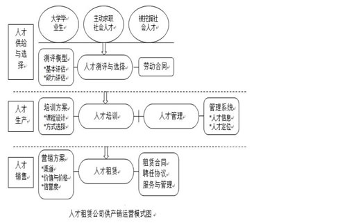 作為人才與用人單位的橋梁,人才租賃公司的運營模式直接影響到人才租賃這種就業(yè)形式和用人方式的發(fā)展,也關乎整個勞動力市場的運作。人才租賃公司的生存和發(fā)展主要依靠對人才的經營,人才雖然與普通產品具有較大差別,但對人才租賃公司來講同樣需要經歷基本“供給—生產—銷售”等環(huán)節(jié)。具體來講,可以將人才租賃公司的供產銷運營模式用下圖表示。