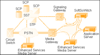 在PSTN網(wǎng),交換機(jī)組、SCP(Service Connection Points)和媒體服務(wù)器協(xié)同工作,為用戶提供服務(wù)。在包交換網(wǎng)絡(luò)環(huán)境,這種服務(wù)由軟件交換機(jī)(Softswiches)、媒體服務(wù)器和應(yīng)用服務(wù)器協(xié)同提供。連接這兩種網(wǎng)絡(luò)的橋梁是媒體網(wǎng)關(guān)和信令網(wǎng)關(guān)。值得注意的是,包交換中的部件都是邏輯點(diǎn),其多個部件可能僅僅由網(wǎng)絡(luò)中的一個應(yīng)用硬件平臺提供。例如:一個基于網(wǎng)絡(luò)提供語音識別功能的語音郵件系統(tǒng)可能包括如下模塊: