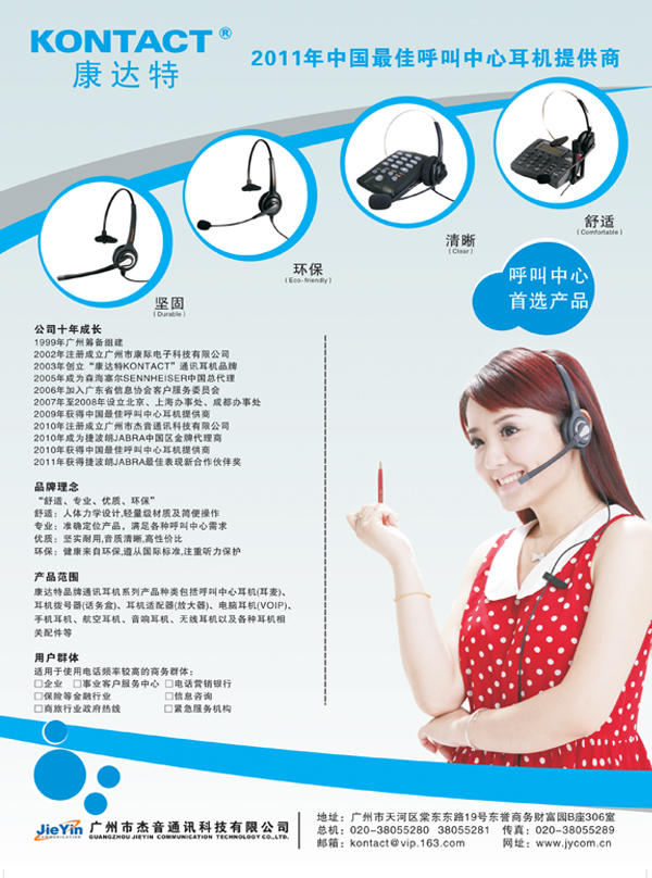 康達特通訊耳機產品主要應用于企業(yè)和政府的客戶服務中心、電話營銷中心、商務中心、緊急指揮中心、酒店總機等辦公場所,對于長期從事電話營銷、電話咨詢、商務調查等工作人員,是一件必不可少的通訊工具。