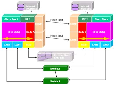 在網(wǎng)絡(luò)方面,上圖的兩臺CompactPCI系統(tǒng)各有兩個(gè)LAN,分別可透過Switch經(jīng)由防火墻連接到外部網(wǎng)絡(luò)。兩個(gè)Switch之間有網(wǎng)絡(luò)連通,且每個(gè)系統(tǒng)至少有兩個(gè)LAN可維持系統(tǒng)的網(wǎng)絡(luò)通暢。