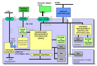 - 標準型IPMI系統(tǒng):利用背板上的IPMB總線,在系統(tǒng)槽上的CompactPCI單板上設(shè)計一顆BMC的控制器,其余在PCI插槽上的外圍片只要存在簡單的IPMI命令兼容的控制器,系統(tǒng)槽的單板即可透過IPMB讀取所有外圍片的狀態(tài),然后再經(jīng)由序列或是網(wǎng)絡的形式通知系統(tǒng)管理者。