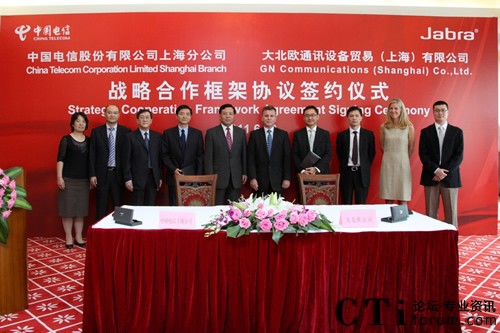 CTI論壇(ctiforum)6月23日消息(記者 楊佳林):上!蝾I(lǐng)先的創(chuàng)新耳麥解決方案提供商大北歐公司(GN Netcom)與中國電信上海公司(以下簡(jiǎn)稱上海電信)今日隆重舉辦了 “戰(zhàn)略合作框架協(xié)議簽約儀式”。上海電信資深經(jīng)理花銳強(qiáng)、大北歐公司亞太區(qū)總裁Mark Leigh,及雙方公司高層領(lǐng)導(dǎo)共同出席了此次慶典。Mark Leigh先生還代表了大北歐公司將Edouard Suenson先生——“將電報(bào)引入中國的丹麥人”的雕像捐贈(zèng)給上海電信博物館,見證了中國與丹麥源于19世紀(jì)末在通信方面的成功合作。