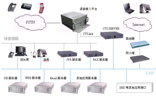 基本部分是呼叫中心的必要組成部分;静糠职ǎ褐悄芫W絡(IN)、自動呼叫分配設備(ACD)、交互式語音應答系統(tǒng)(IVR)、CTI服務器、人工座席、數(shù)據(jù)庫服務器、管理平臺等;擴展部分是隨著呼叫中心技術的發(fā)展而逐漸豐富的,擴展部分目前主要包括:Web服務器、Email服務器、傳真服務器、IP電話網關等。系統(tǒng)結構如下圖所示: