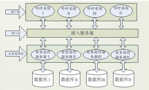 針對(duì)舊外呼業(yè)務(wù)系統(tǒng)的弊端及業(yè)務(wù)系統(tǒng)特點(diǎn),賽迪呼叫研發(fā)了基于三層C/S結(jié)構(gòu)的外呼業(yè)務(wù)系統(tǒng),該系統(tǒng)分客戶端,接入服務(wù)器,業(yè)務(wù)服務(wù)器及數(shù)據(jù)庫(kù)端。客戶端發(fā)送請(qǐng)求給分配服務(wù)器,接受到請(qǐng)求后,分配服務(wù)器根據(jù)客戶端的請(qǐng)求數(shù)據(jù)將其分配給自身的業(yè)務(wù)服務(wù)器做業(yè)務(wù)處理,這樣客戶端與業(yè)務(wù)服務(wù)器建立起聯(lián)系,結(jié)構(gòu)體系如圖:
