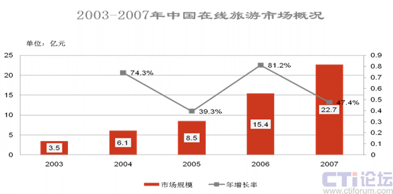 根據(jù)Iresearch的數(shù)據(jù),2007年,中國(guó)在線旅游市場(chǎng)規(guī)模達(dá)到22.7億元,比06年同比增長(zhǎng)47.5%;其中攜程以56.3%的市場(chǎng)份額繼續(xù)領(lǐng)跑,比06年的54.2%增長(zhǎng)了2個(gè)百分點(diǎn)。與此相對(duì)比的是,美國(guó)三強(qiáng)旅游網(wǎng)站之一的Travelocity,在06年第一季度的全球營(yíng)收就達(dá)到了24億美金。具體情況如下圖所示: