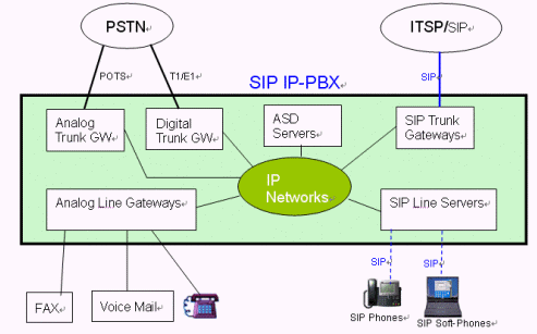 MOSA的SIP IP-PBX是一個完整的商用交換機(jī)系統(tǒng),能提供企業(yè)完整的通信服務(wù),因應(yīng)各種不同接口的連結(jié)需求,例如公眾電信系統(tǒng)(PSTN)、SIP服務(wù)商、傳真機(jī)、電話機(jī)、語音信箱、SIP IP Phone、SIP Soft-phone、Wifi-Phone以及各種SIP終端設(shè)備等等,MOSA的SIP IP-PBX提供模塊化的接口連接設(shè)備,每一種接口連接設(shè)備均配備有以太網(wǎng)絡(luò)接口,可以透過IP網(wǎng)絡(luò)相互連結(jié),使得各分公司之間通信零距離。MOSA SIP IP-PBX除了解決基本的接口連接外,也提供各式各樣的應(yīng)用服務(wù)服務(wù)器(Application Service Devices),增進(jìn)整體系統(tǒng)的功能,譬如:網(wǎng)絡(luò)型電話會議,網(wǎng)絡(luò)型廣播,移動辦公功能等。
