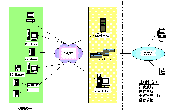 控制中心:包括資源管理系統(tǒng)、計(jì)費(fèi)系統(tǒng)、網(wǎng)管系統(tǒng)、語音信箱。 其中,資源管理系統(tǒng)主要執(zhí)行地址翻譯、權(quán)限控制、路由管理等功能;計(jì)費(fèi)系統(tǒng)主要完成計(jì)費(fèi)及結(jié)算功能;網(wǎng)管系統(tǒng)完成對網(wǎng)絡(luò)及IP PBX運(yùn)行的維護(hù)管理