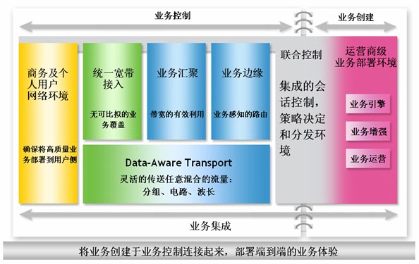 首先,我們提供了智能的、具備業(yè)務感知能力的、安全的融合網(wǎng)絡:這意味著通過安全的網(wǎng)絡將正確的業(yè)務部署到正確的客戶端,并保證最高體驗質(zhì)量。它的本質(zhì)是在網(wǎng)絡的各個層面部署智能化和業(yè)務感知的元素,并實施完整的安全機制,正如我們前面提到的,業(yè)務演進與網(wǎng)絡間相互有著緊密關聯(lián),為達到業(yè)務需求,網(wǎng)絡需要能夠根據(jù)業(yè)務進行靈活調(diào)整。