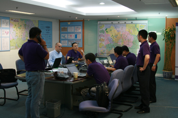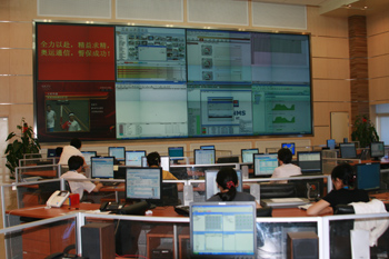 上海貝爾阿爾卡特工程師在公司設(shè)立在北京的奧運保障指揮部緊張工作