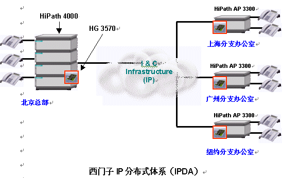 IP分布式體系(IPDA)建于西門子HiPath通信平臺之上,它能解決您的上述煩惱。在各分支辦公室部署HiPath接入點(Access Point)后,同時在集成IP網(wǎng)關HiPath HG 3500家族的幫助下,HiPath能夠建立起一個將所有分支辦公室包括在內的IP通信網(wǎng)絡。