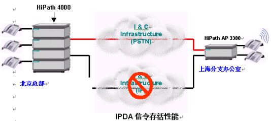 人們也許會問,IP語音(VoIP)是否足夠可靠?如果IP網(wǎng)絡上的信令通道出現(xiàn)故障,HiPath平臺仍將保證對各接入點的控制,從而提供了可靠的信令存活性能(Signaling Survivability)。在下面的圖例中,當企業(yè)IP網(wǎng)絡出現(xiàn)某些問題后,信令通道轉移到了公共交換電話網(wǎng)絡(PSTN)之上。