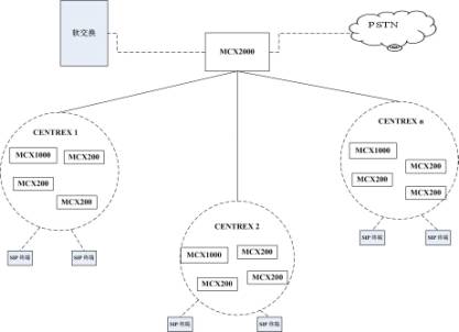 MCX2000支持連接多個(gè)屬于不同企業(yè)的MCX200/1000,能夠把同一個(gè)企業(yè)的不同MCX200/1000集中組成IP CENTREX群,支持群內(nèi)呼叫、群外呼入、群外呼出等功能,使用戶感覺(jué)不到多個(gè)MCX200的存在,如同所有的用戶在同一個(gè)交換設(shè)備內(nèi)。MCX2000同時(shí)支持多個(gè)IP