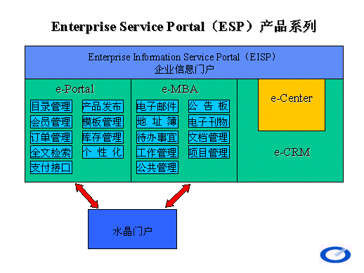 以上軟件產(chǎn)品共同構(gòu)成了瑞尊公司關(guān)于電子商務(wù)時代的幫助企業(yè)進(jìn)行經(jīng)營、管理的軟件解決方案,ESP -企業(yè)服務(wù)門戶。ESP 可以廣泛應(yīng)用于銀行、保險、電信、電力和生產(chǎn)制造型企業(yè)以及ICP 和政府機關(guān)等。ESP 既可作為一個軟件產(chǎn)品包進(jìn)行銷售,也可以分成不同產(chǎn)品分別銷售。ESP 不但滿足大中型企業(yè)及政府機構(gòu)的需要,而且將E -Portal 和E -MBA 功能加以融合,推出了針對中小企業(yè)和部門級用戶即裝即用的ESP 普及型產(chǎn)品-水晶門戶。水晶門戶能夠幫助中小企業(yè)快速構(gòu)造各種類型的企業(yè)網(wǎng)站,展示企業(yè)形象、服務(wù)及產(chǎn)品;快速構(gòu)造基于瀏覽器的企業(yè)對內(nèi)信息管理及辦公系統(tǒng),包括文檔管理、郵件、公告板、公共信息等。