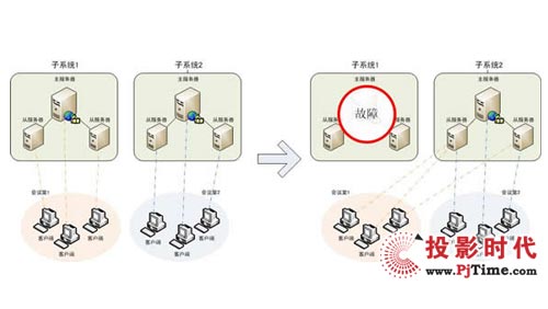 當(dāng)一個子系統(tǒng)出現(xiàn)故障時,系統(tǒng)可以自動將故障子系統(tǒng)上的會議遷移到其他子系統(tǒng)上,做到子系統(tǒng)互為備份,極大提高了系統(tǒng)的運(yùn)行支撐能力。