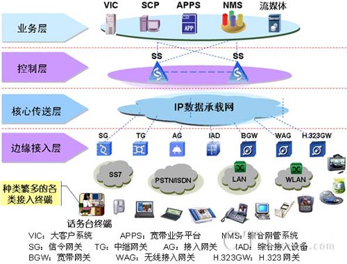 邊緣接入層:主要指與現(xiàn)有網(wǎng)絡(luò)相關(guān)的各種網(wǎng)關(guān)和新型接入終端設(shè)備,完成與現(xiàn)有各種類型的通信網(wǎng)絡(luò)的互通并提供各類通信終端(如模擬話機(jī)、SIP Phone、PC Phone、可視終端、智能終端等)到IP核心層的接入。
