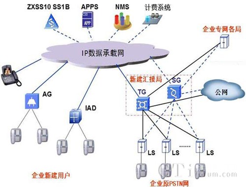 對于后續(xù)新建的用戶,根據(jù)本地網(wǎng)資源,可以新建接入網(wǎng)關(guān)、IAD等實(shí)現(xiàn)用戶接入。組網(wǎng)方案如下圖所示: