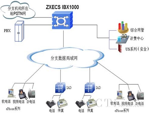 同時(shí)在各分支結(jié)構(gòu),可通過中興通訊ZXECS IBX1000綜合媒體網(wǎng)關(guān)提供到各地PSTN的語音落地,實(shí)現(xiàn)與各地PSTN的互通。