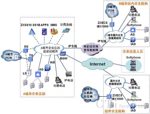 隨著大企業(yè)業(yè)務(wù)的不斷擴(kuò)大,在其他地區(qū)會(huì)建立一些分支機(jī)構(gòu)。針對這些需求,中興通訊推薦IP-PBX的多媒體組網(wǎng)方案,方案如下: