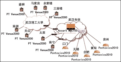 武漢理工大學(xué)的遠(yuǎn)程教學(xué)系統(tǒng)由于分2期建設(shè),網(wǎng)絡(luò)條件較為復(fù)雜。一期主要以PT的Venue2000終端+Accord MGC100 MCU為主,是H.323系統(tǒng);二期采用Penteview2010終端+Penteview6088MCU,是H.320系統(tǒng),此案例是國(guó)內(nèi)首家教育行業(yè)H.320與H.323混合組網(wǎng)方式的視頻電視遠(yuǎn)程教學(xué)網(wǎng)。各教室均采用了中太數(shù)據(jù)的遠(yuǎn)程教學(xué)中控系統(tǒng),整個(gè)組網(wǎng)采用星型結(jié)構(gòu),2010和6088之間采用512k的DDN專(zhuān)線(xiàn)連接,其中,384k用于傳輸視頻、音頻,128k用于傳輸T.120數(shù)據(jù)。2010設(shè)備及其標(biāo)準(zhǔn)外設(shè),加上符合遠(yuǎn)程教育功能需要的其他外設(shè),構(gòu)成遠(yuǎn)程教育網(wǎng)絡(luò)專(zhuān)用教室的設(shè)備配置。