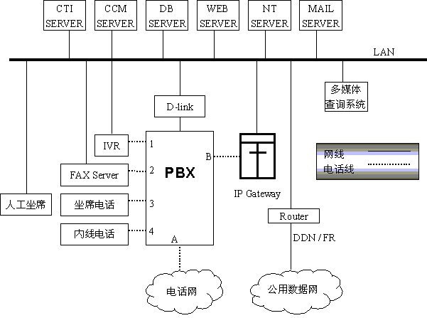 上圖所示的分布于不同地區(qū)的多個系統(tǒng)可以互相聯(lián)接,構(gòu)成分布式客戶服務中心,如地市話務員回答不了客戶的問題,可轉(zhuǎn)接到省中心,話務員在坐席上操作請求CCM轉(zhuǎn)接省中心,CCM通過CTI SERVER控制PBX將A與B接通,IP網(wǎng)關響應呼叫,將電話號碼信號翻譯成相關的IP地址,將線路上的語音信號處理成數(shù)據(jù)信息并打包,通過本地LAN、本地ROTUER、公用數(shù)據(jù)網(wǎng)、省中心LAN等發(fā)送到省中心的IP網(wǎng)關、呼叫到達省中心PBX的B,按省中心系統(tǒng)的排隊和選擇坐席的規(guī)則選擇坐席,省中心的IP網(wǎng)關將接收到的數(shù)據(jù)解包還原成語音信號通過B送坐席電話3,雙方通話。這樣全省各市縣將聯(lián)結(jié)成一個大的分布式呼叫中心,同時IP電話也可用于企業(yè)內(nèi)部通信,通信費將降至原來的一半以下。