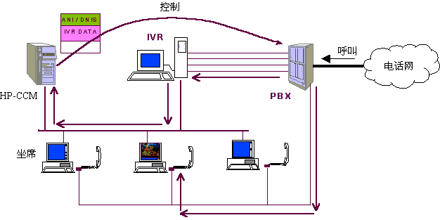 在任何一個步驟中,如客戶選擇了人工坐席,則IVR請求CCM根據(jù)多種情況選擇一個空閑坐席(選擇方法見下文)并控制PBX將呼叫與選擇的人工坐席接通,同時系統(tǒng)在客戶對IVR操作的過程中,已經(jīng)幀測到了客戶所使用的電話號碼、客戶的按鍵信息,系統(tǒng)還記錄有客戶上次的呼叫情況等數(shù)據(jù),這些數(shù)據(jù)基本上可以確定客戶大體關心的問題,對于老客戶甚至可以初步認定呼叫者的身份、年齡、性別、業(yè)務辦理情況等,因此,話務員在與客戶談話之前就已經(jīng)了解了相當多的信息,并控制選定的坐席屏幕顯示有關客戶信息,便于直接進入正題,提高了效率?蛻襞c坐席的交流過程中,坐席可通過終端請求CCM控制PBX將本次呼叫與其他話務員(坐席)、專家或業(yè)務辦公室(如內(nèi)線電話)等接通,當坐席人員將呼叫轉(zhuǎn)移到另一坐席或?qū)<視r,系統(tǒng)將在本呼叫中收集的各類數(shù)據(jù)同時轉(zhuǎn)向下一坐席電腦。在坐席人員解答客戶問題時,可將問題及解答情況收集,便于分析坐席人員的業(yè)務素質(zhì)和問題傾向,從而有針對性地培訓坐席人員。對于客戶來講,他可以通過電話按鍵在話務員、自動語音、傳真、專家和業(yè)務辦公室之間漫游,系統(tǒng)將記錄客戶漫游的路徑,對于設計較好的菜單和路經(jīng)來說,客戶的漫游路徑基本上可以反映出其需求,大量客戶的漫游路徑無疑將反映出市場需求。