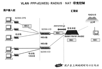 圖2所示的是VDSL技術(shù)與以太網(wǎng)技術(shù)聯(lián)合打造的新型接入方案。武漢烽火網(wǎng)絡(luò)公司生產(chǎn)的S2300系列VDSL交換機(jī)使用戶在現(xiàn)有電話線路上獨立享用固定的獨立的帶寬,安全地進(jìn)行數(shù)據(jù)連接,同時以太網(wǎng)的PPPoE認(rèn)證、NAT地址變換等功能又將用戶帶入迷幻的網(wǎng)絡(luò)世界。
