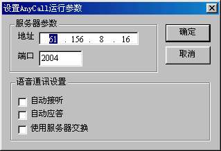 AnyCall還為用戶提供了一些個性化的設(shè)置,點擊AnyCall的設(shè)置按鈕。就會彈出一個對話框在里面有服務(wù)器參數(shù)和語音通訊設(shè)置兩個設(shè)置項,如圖4所示。服務(wù)器參數(shù)主要是設(shè)置AnyCall的語音交換服務(wù)器的IP地址和端口,以便進行更好的語音傳輸。在語音通訊里面可以設(shè)置自動應(yīng)答,自動接聽。這樣免去了每次來電都要去點接聽按鈕的麻煩。