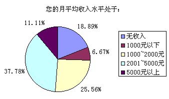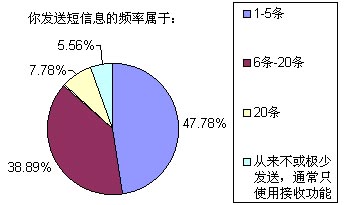 以上選擇中,選擇答案A~E的被訪者比例分別為18.89%、6.67%、25.56%、37.78%和11.11%,也就是說我們這次調(diào)查的重頭是放在一般收入水平和無收入(學(xué)生)兩類人群,這兩個人群也正是SMS市場上最活躍的分子。高收入和低收入人群要么因?yàn)橘Y金充裕而選擇語音業(yè)務(wù),要么就是因?yàn)橘Y金的缺乏而盡量不使用移動通信方式。
