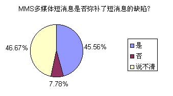 問卷的調(diào)查結(jié)果有些屬于意料之中,有些則暫一定程度上給運(yùn)營商和終端提供上潑了冷水。不過,有一點(diǎn)是讓提供移動服務(wù)的企業(yè)感到欣慰和滿意的,那就是:最終用戶對MMS的接受程度相當(dāng)高,除去對資費(fèi)、操作的質(zhì)疑外,幾乎90%以上的用戶都認(rèn)為MMS廣泛流行是一個必然的趨勢。下面我們就讀者們廣泛關(guān)注的問題來研究一下。