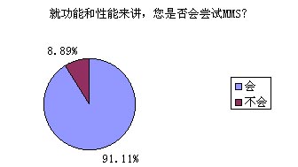 題8的調(diào)查結(jié)果對于中國移動來講絕對是充滿誘惑的,高達(dá)91.11%的被訪者表示他們非常愿意嘗試MMS的功能和服務(wù),無疑這對ICP們(MMS服務(wù)的重要載體)也是一針強(qiáng)心劑啊!