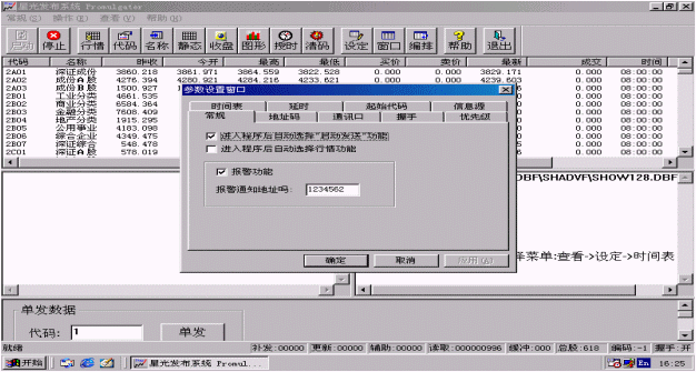 常規(guī)設(shè)置有可選擇<進(jìn)入程序后自動(dòng)選擇"啟動(dòng)發(fā)送"功能>、<進(jìn)入程序后自動(dòng)選擇行情功能>、<報(bào)警功能>及報(bào)警通知地址碼的設(shè)置。啟動(dòng)報(bào)警功能后,當(dāng)信息源中斷時(shí)系統(tǒng)就會(huì)發(fā)出報(bào)警通知。