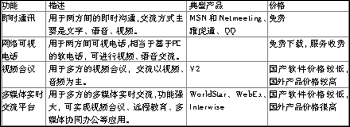 從結(jié)構(gòu)上,軟件視頻產(chǎn)品基本分為兩大類:一類是點(diǎn)對點(diǎn),另一類是一點(diǎn)對多點(diǎn)。點(diǎn)對點(diǎn)產(chǎn)品僅限于兩人之間的交流,此類典型產(chǎn)品有微軟的MSN和NetMeeting、Yahoo的雅虎通、QQ等;一點(diǎn)對多點(diǎn)產(chǎn)品用于多方的實(shí)時(shí)交流,此類產(chǎn)品是各種軟件解決方案的軟件視頻會(huì)議產(chǎn)品,如:北京捷先科技的WorldStar、威速公司的V2等。根據(jù)用途的不同,軟件視頻產(chǎn)品大致分為即時(shí)通訊產(chǎn)品(如MSN和NetMeeting、雅虎通、QQ)、網(wǎng)絡(luò)可視電話產(chǎn)品、視頻會(huì)議產(chǎn)品(如:V2)、多媒體實(shí)時(shí)交流平臺(tái)產(chǎn)品(如:WorldStar、WebEx、Interwise等),分類如表。