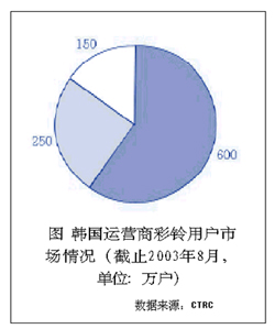 彩鈴業(yè)務最先是由韓國的SK電信于2002年3月推出的,業(yè)務一經(jīng)面世就吸引了移動用戶、特別是年青用戶群體的眼球,開通的用戶數(shù)和業(yè)務使用率呈指數(shù)式增長;同時由彩鈴業(yè)務帶來的互聯(lián)網(wǎng)、WAP和IVR的話務量的增長進一步提升了彩鈴業(yè)務的含金量。隨后韓國的其他兩個移動運營商LG電信和韓國電信也分別于2002年6月和9月相繼開通彩鈴業(yè)務。經(jīng)過運營商和彩鈴的內(nèi)容提供商的前期市場推廣和運作,目前已發(fā)展了近1000萬用戶,其中運營商的市場份額如圖所示。