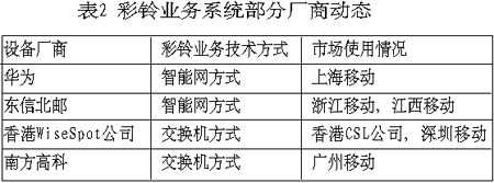 目前市場上有技術能力提供彩鈴業(yè)務系統(tǒng)的廠商主要有韓國的設備商Witcom和 OnionTech21,以及其他國外廠商如Comverse和WiseSpot,國內(nèi)廠商有華為、中興、南方高科、東信北郵等。各廠商都在和移動運營商合作部署其彩鈴業(yè)務系統(tǒng),力爭成為市場的領先者,如華為在上海移動建設了其智能網(wǎng)方式的彩鈴業(yè)務系統(tǒng),通過其原有的智能網(wǎng)系統(tǒng)的更新升級實現(xiàn)彩鈴業(yè)務。現(xiàn)在已有確切消息證實,彩鈴業(yè)務將于今年10月1日起正式商用,同時進入商用的還有北京移動的彩鈴業(yè)務。與此同時,東信北郵也與浙江移動、江西移動合作開通彩鈴業(yè)務,于2003年3月25日彩鈴業(yè)務通過現(xiàn)網(wǎng)實用測試。