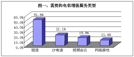 在圖一中,除短信外的IP電話、視頻會議和網(wǎng)絡(luò)游戲的百分比差距不大,這說明這幾個市場將接踵而至,而且規(guī)模漸現(xiàn)。事實也證明今年是電信增值服務(wù)開始收獲的一年,先是移動市場上短信的紅火,隨之而來的是固話市場上IP電話的風(fēng)靡。由于打長途電話可以節(jié)省70%的話費,今年年初以來IP超市、IP面值卡、IP主叫、IP專線等業(yè)務(wù)都獲得長足發(fā)展。隨后是視頻會議,今年也獲得突破性進展。在9月末的北京視頻會議論壇上人們可以看到品種豐富并且全面商用的視頻設(shè)備。視頻會議的發(fā)展無疑一方面基于逐步完善的運營網(wǎng)絡(luò),另一方面受到“非典”的拉動。