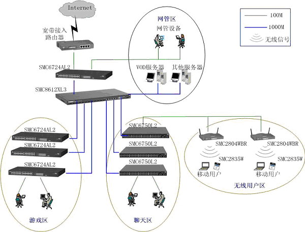 本方案采用"千兆光纖干線,百兆交換到桌面"的設(shè)計思路,各骨干線路均為1000M。骨干網(wǎng)通過高速線路接入INTERNET,網(wǎng)吧內(nèi)實現(xiàn)主干千兆交換、百兆到點,整個網(wǎng)吧內(nèi)實現(xiàn)無阻塞通信。根據(jù)顧客的不同消費需求,將網(wǎng)吧分為了網(wǎng)絡(luò)游戲區(qū)、聊天區(qū)、貴賓區(qū)等,根據(jù)不同區(qū)域的特點,細(xì)化了不同網(wǎng)絡(luò)的解決方案。方案中采用的核心設(shè)備和二層設(shè)備都支持802.1Q標(biāo)準(zhǔn)VLAN和IGMP組播協(xié)議,為VOD、多媒體娛樂等豐富應(yīng)用的開展打下了堅實的基礎(chǔ) 。通過劃分VLAN,MAC地址綁定來劃分了不同類型用戶,很好地滿足網(wǎng)吧的各項業(yè)務(wù)應(yīng)用需求。此外,SMC的豐富無線網(wǎng)絡(luò)產(chǎn)品可以很靈活的滿足網(wǎng)吧的組網(wǎng)需求,投資少、施工快。在提供高性能的同時,還保證很好的安全性,既支持基于802.11b標(biāo)準(zhǔn)的安全機制,又支持動態(tài)安全鏈路,以及基于802.1x的增強性安全或認(rèn)證功能。