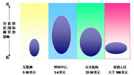 值得注意的是,外呼只是一個手段,它必須和企業(yè)的信息收集、整理、數(shù)據(jù)挖掘、市場策略的制訂等各個環(huán)節(jié)有機的結(jié)合起來才能發(fā)揮最大的功效。利用呼叫中心的外呼模式進行此類業(yè)務(wù)有著其他渠道無法比擬的優(yōu)勢,相對于郵件、信函、分支機構(gòu)、直銷人員等方式而言對客戶的影響力要大,而成本也相對比較便宜。下圖是著名國際咨詢機構(gòu)德勤公司對各種渠道與客戶接觸成本的分析: