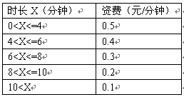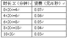 例3,國內(nèi)長途話費在時長不超過4分鐘的情況下,按0.07元/6秒收。怀^4分鐘但不超過6分鐘,統(tǒng)一按0.06元/6秒收;超過6分鐘但不超過8分鐘,統(tǒng)一按0.05元/6秒收取;超過8分鐘但不超過10分鐘,統(tǒng)一按0.04元/6秒收;超過10分鐘,統(tǒng)一按0.03元/6秒收取。