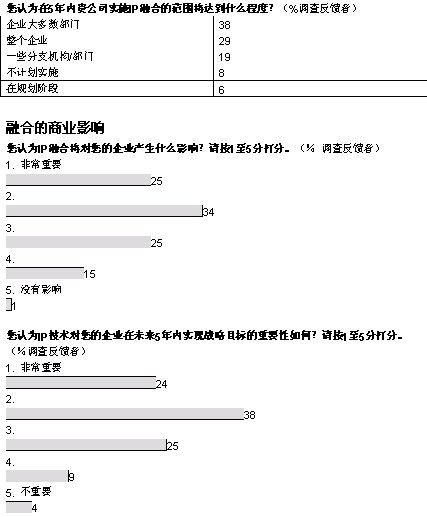 我們調(diào)查的企業(yè)中,有超過(guò)三分之二將在未來(lái)五年內(nèi)實(shí)現(xiàn)大多數(shù)或者所有部門(mén)向融合網(wǎng)絡(luò)的轉(zhuǎn)型。大部分企業(yè)采取按部就班的形式在某些特殊部門(mén)和業(yè)務(wù)開(kāi)始部署。在融合應(yīng)用中,IP語(yǔ)音電話將在未來(lái)三年內(nèi)吸引大量投資;管理人士期望通過(guò)大幅削減公司內(nèi)部的通話費(fèi)用獲得早期的回報(bào)。在更廣泛的層面上,大多數(shù)管理者預(yù)計(jì),融合網(wǎng)絡(luò)對(duì)其企業(yè)的商業(yè)影響將會(huì)“非常重要”或者“重要”。