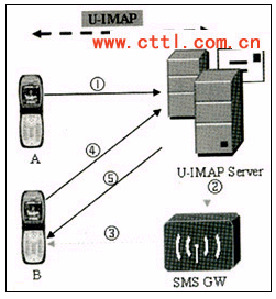1)多媒體郵件由移動手機終端A發(fā)送到服務(wù)器UIMAP Server;