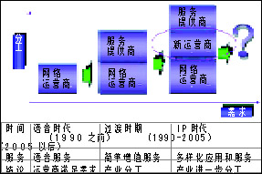 Switch(軟交換)、3G、IPv6等技術(shù)進(jìn)行系統(tǒng)構(gòu)筑,全面融合先進(jìn)的語音、數(shù)據(jù)及移動(dòng)通信IP一體化解決方案,從而為企業(yè)提供不同需求層次的選擇。另外,由此導(dǎo)致產(chǎn)業(yè)結(jié)構(gòu)也悄悄地發(fā)生變化,產(chǎn)業(yè)朝三層級(jí)和多層級(jí)演變通信的新結(jié)構(gòu)和新角色:服務(wù)運(yùn)營商的誕生,網(wǎng)絡(luò)運(yùn)營商向服務(wù)提供商的轉(zhuǎn)型。