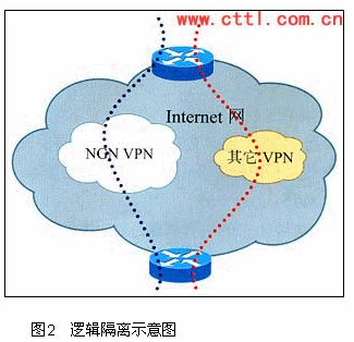 從圖1可以看出,物理隔離是指另外建設一張IP專網(wǎng),主要是在匯聚層和骨干網(wǎng)層面上采用雙網(wǎng)結構:一張網(wǎng)絡承載Internet業(yè)務,稱之為Internet網(wǎng),主要提供傳統(tǒng)互聯(lián)網(wǎng)業(yè)務,按照上網(wǎng)時間及內容收費。另一張網(wǎng)絡承載IP電信業(yè)務,提供高質量的電信級業(yè)務,滿足NGN,3G對承載網(wǎng)的需求,支持VPN,視訊,語音以及流媒體等業(yè)務的要求,稱之為IP專網(wǎng)。