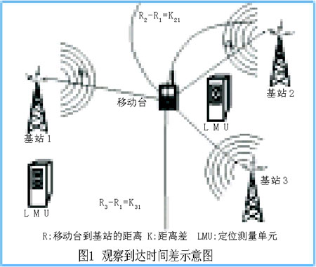 觀察到達(dá)時(shí)間差(OTDOA)是通過測量電波從發(fā)射機(jī)傳播到多個(gè)接收機(jī)的傳播時(shí)間差來確定目標(biāo)移動(dòng)臺(tái)的位置。初步測量通過UE接收的下行鏈路公共導(dǎo)頻信道的到達(dá)時(shí)間差實(shí)現(xiàn)。3個(gè)基站形成的平面上,一點(diǎn)到兩個(gè)固定點(diǎn)的距離差如為定值時(shí),該點(diǎn)必定在一條雙曲線上,兩條這樣的雙曲線的交點(diǎn)便可得到移動(dòng)臺(tái)的位置,如圖1