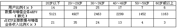 與競爭對(duì)手SKT一樣,KTF針對(duì)不同年齡段的用戶建立了個(gè)性化的獨(dú)立服務(wù)品牌,這些服務(wù)品牌分別是BiGi(主要針對(duì)13~18歲的未成年人)、Na(主要針對(duì)18~25歲的青年學(xué)生)、Main(針對(duì)25~35歲的男性用戶)、Hyo(針對(duì)35歲以上用戶)以及DRAMA(針對(duì)所有年齡的女性用戶)。從各年齡用戶群的業(yè)務(wù)使用情況看,占總用戶43%的30歲以下年輕用戶是KTF最主要的數(shù)據(jù)與增值業(yè)務(wù)消費(fèi)群體。見表4。