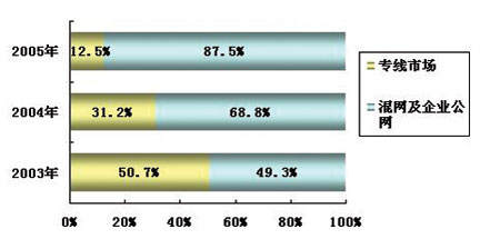 2004年,基于專(zhuān)線(xiàn)網(wǎng)絡(luò)的視頻會(huì)議系統(tǒng)與基于混網(wǎng)和企業(yè)公網(wǎng)的產(chǎn)品比例發(fā)生了轉(zhuǎn)折性變化,基于混網(wǎng)和企業(yè)公網(wǎng)的產(chǎn)品占到了68.8%的比例,成為了市場(chǎng)主流。計(jì)世資訊(CCW Research)研究表明:2005年,這一趨勢(shì)更趨明顯,基于混網(wǎng)和企業(yè)公網(wǎng)產(chǎn)品的比例將高達(dá)87.5%。